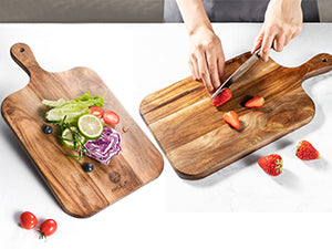 This acacia cutting board comes with an ergonomic non-slip handle that makes it easy to hold the board while you’re putting the chopped ingredients in the cooking pot. This ensures that your countertops remain clean and uncluttered.And meanwhile which can hang the board on the kitchen walls, and easy to carry when outside picnic or storage.